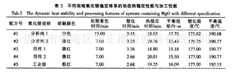 固定氧化鋅為分析純2,用HAAKE流變儀研究了不同規格氧化鎂穩定體系的動態熱穩定性能與加工性能,試驗結果見表3。
