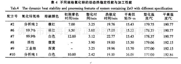表4中的塑化時間、平衡扭矩、塑化溫度、平衡溫度等加工性能差別不太,說明不同規格的氧化鋅與不同規格氧化鎂一樣,對PvC的加工性能沒有明顯影響。從表4還可以看到,用不同規格的氧化鋅,體系的熱穩定性能存在較大差別。純度對于初期穩定和熱穩定時間的影響明顯。對比最為明顯的是兩種高純度氧化鋅,99.9%的氧化鋅比99.7%的氧化鋅的初期著色時間和熱穩定時間都延長了5min左右。工業級氧化鋅則使物料的初期顏色太深.盡管其熱穩定時間仍然接近20 min。兩種分析純氧化鋅也表現了比較好的熱穩定性能。