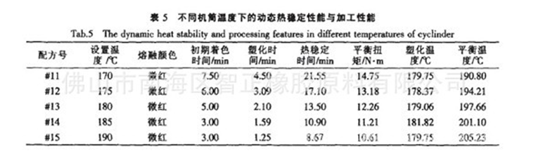 由表5可見。初期著色時間、塑化時間、熱穩定時間、平衡扭矩都隨著設定溫度的提高而減小,平衡溫度則隨著設定溫度的提高而增大。設定溫度在185℃以上時,初期著色時間變得非常短,熱穩定時間下降到1l min以下。這個時間通常不能滿足諸如擠出、注射成型這樣的加工要求。綜合分析,對于這種穩定體系,設備的溫度以不超過180℃為宜。這樣既能滿足試驗觀察比較的方便性要求,也能滿足通常加工方法的受熱時間要求。